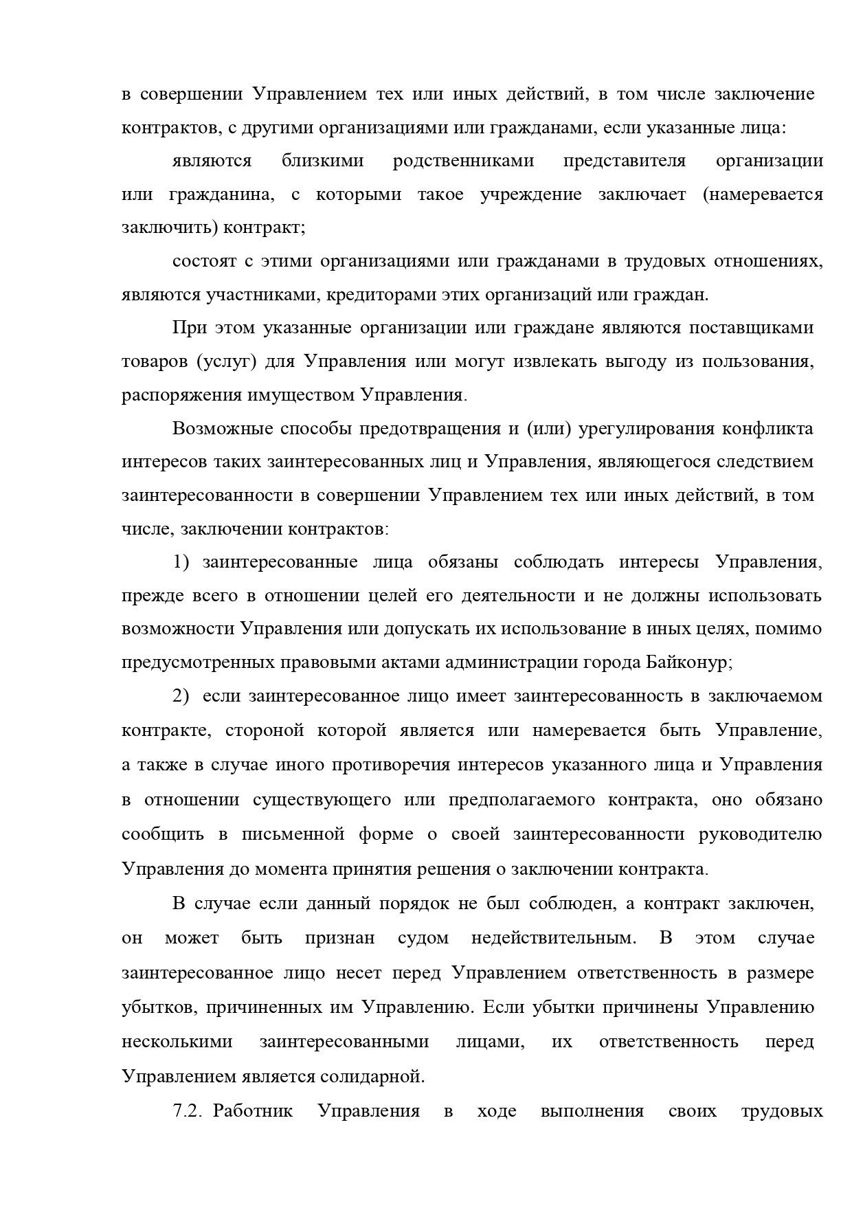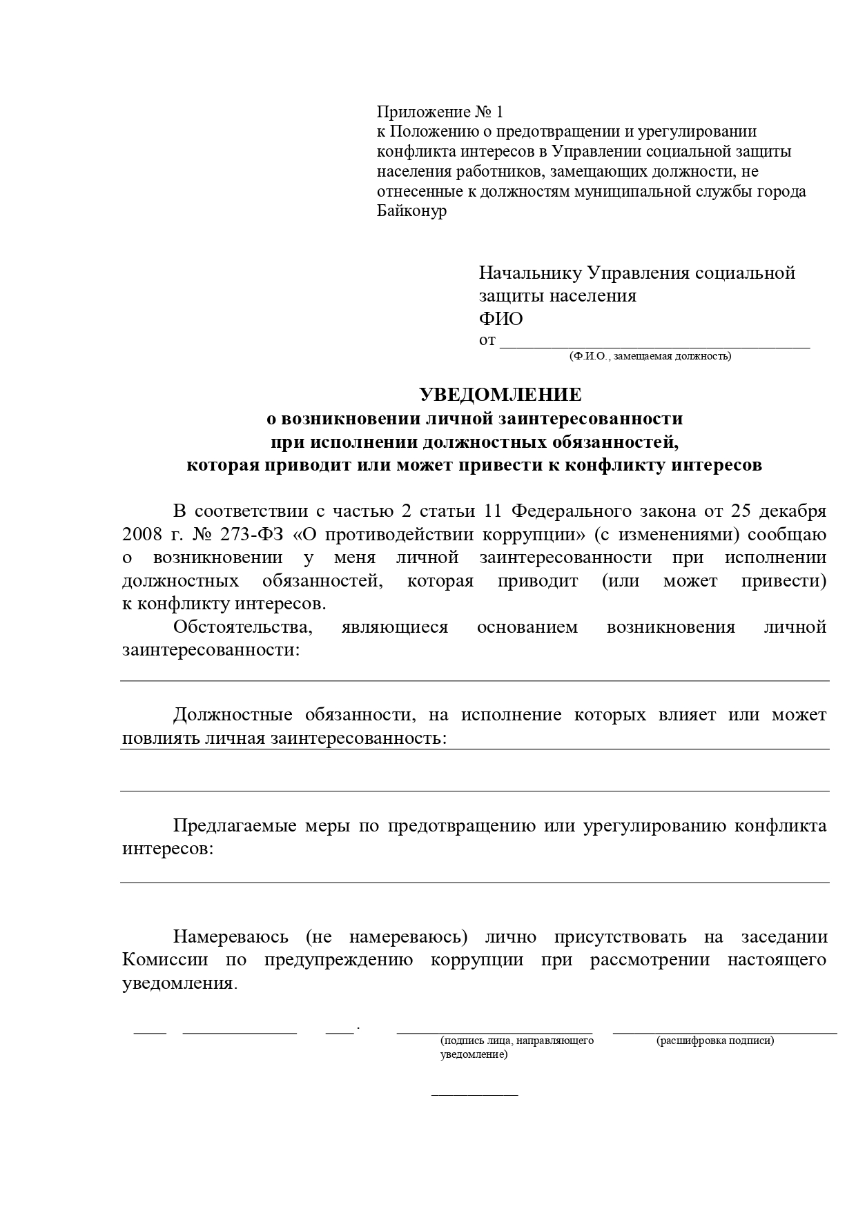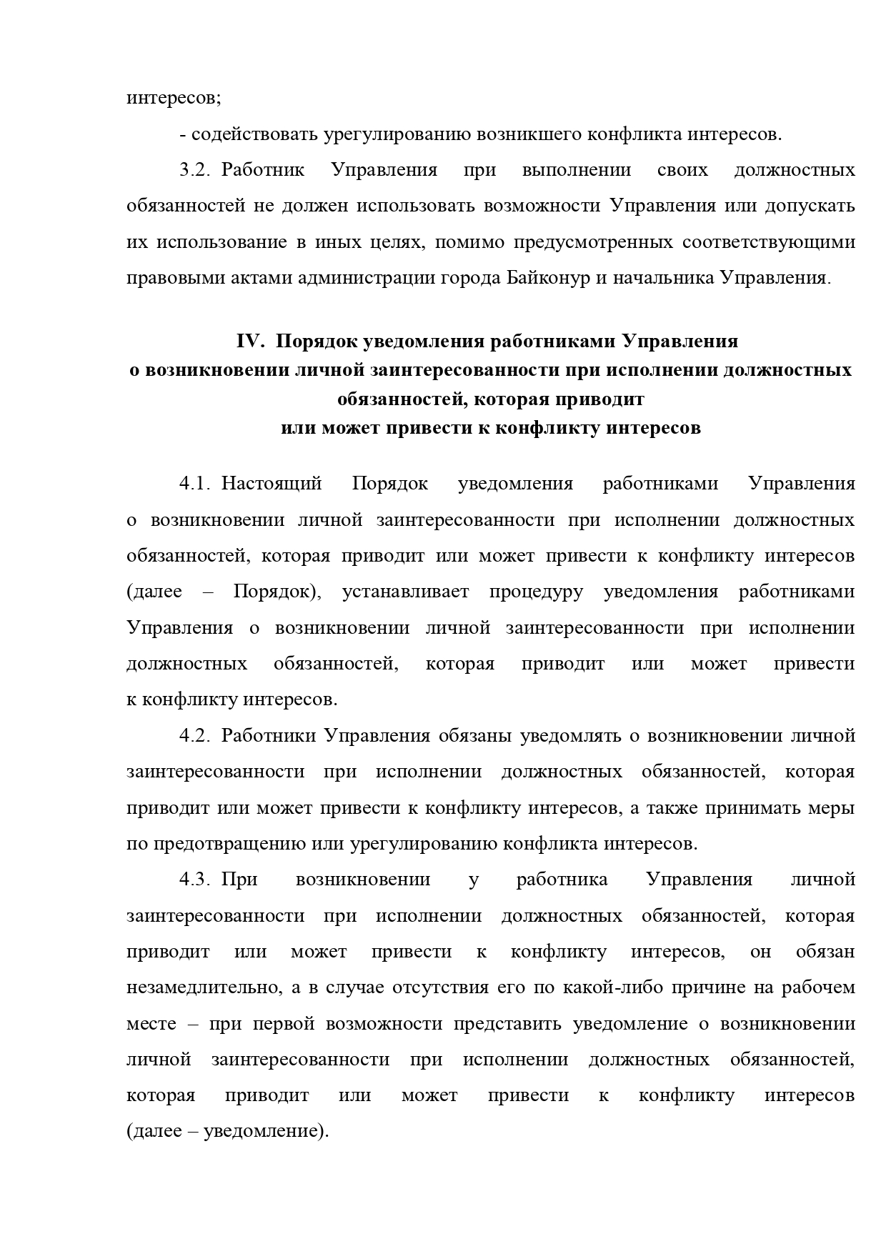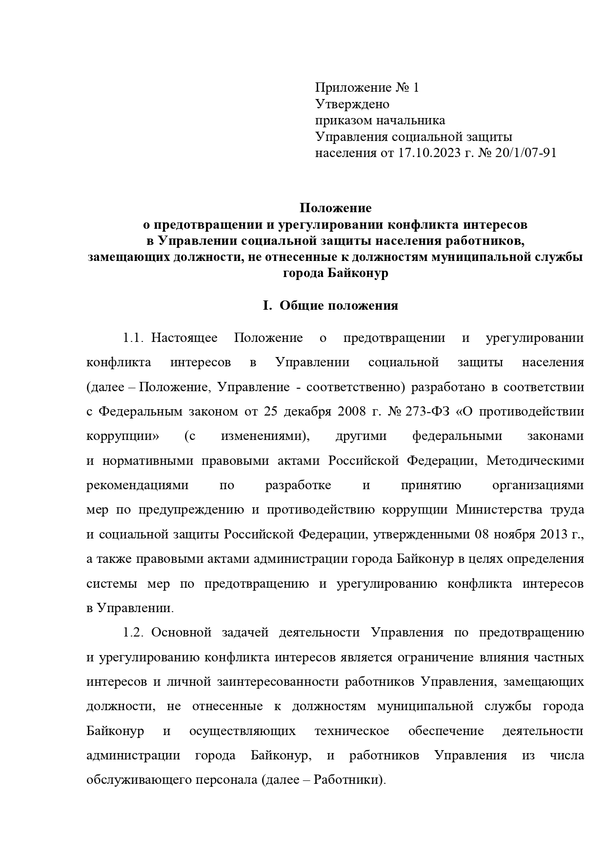 Положение о предотвращении и урегулировании конфликта интересов в Управлении социальной защиты населения работников, замещающих должности, не отнесенные к должностям муниципальной службы города Байконур